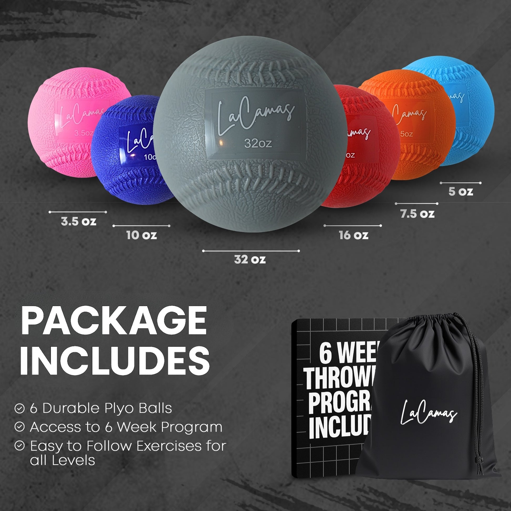 Plyometric Balls for Baseball – Weighted Throwing Set (3.5oz–32oz) with Stitched Seams – 6 Soft-Shell Balls + Carry Bag + Free 6-Week Throwing Program – Arm Care & Velocity Trainer